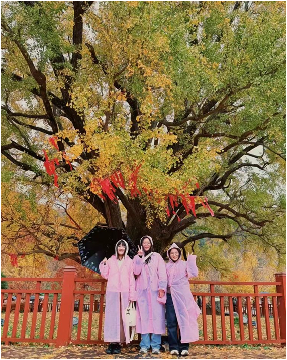 秋風(fēng)輕拂車窗,我們踏上了秋游之路。車內(nèi)一路歌聲作伴,那是歡樂的旋律在飛揚(yáng)。沿著蜿蜒的山路前行,山間的空氣格外清新,老師們來到了千年銀杏樹下,這棵古老的銀杏樹在雨中顯得格外莊重而寧靜,金黃的樹葉在雨水的洗禮下更加鮮亮奪目。