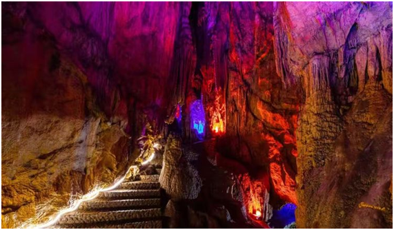 兩王洞,洞內(nèi)陰暗潮濕,彌漫著一層薄薄的霧氣,給人一種神秘莫測的感覺。鐘乳石、石筍、石柱等各種奇特的地質(zhì)景觀在燈光的映照下,呈現(xiàn)出五彩斑斕的色彩,如夢如幻。有的像倒掛的金鐘,有的像騰飛的巨龍,有的像盛開的花朵,形態(tài)逼真,令人嘆為觀止。沿著狹窄的通道緩緩前行,小心翼翼地觸摸著這些大自然的杰作,感受著它們的溫潤與光滑。