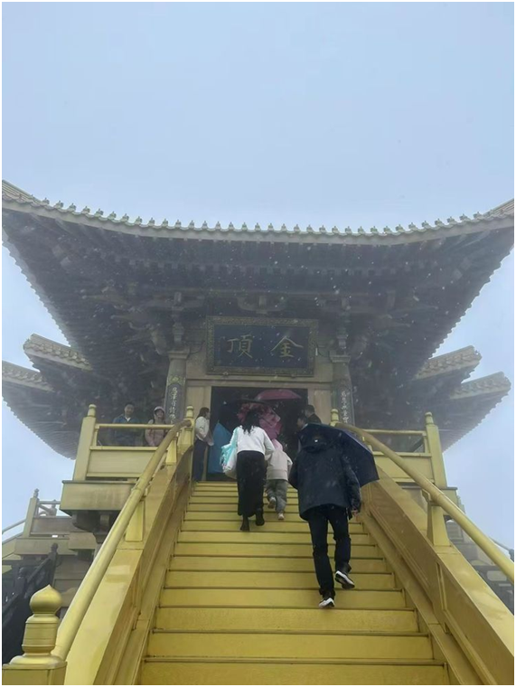 站在金頂,極目遠(yuǎn)眺,眼前是一片云霧繚繞的景象,山峰在云霧中時隱時現(xiàn),宛如仙境一般。感受著那清新的空氣和那無邊的寧靜,雨還在淅淅瀝瀝地下著,打在臉上,帶來一絲涼意,但老師們卻絲毫不覺得冷,反而被這雨中的美景所陶醉。
