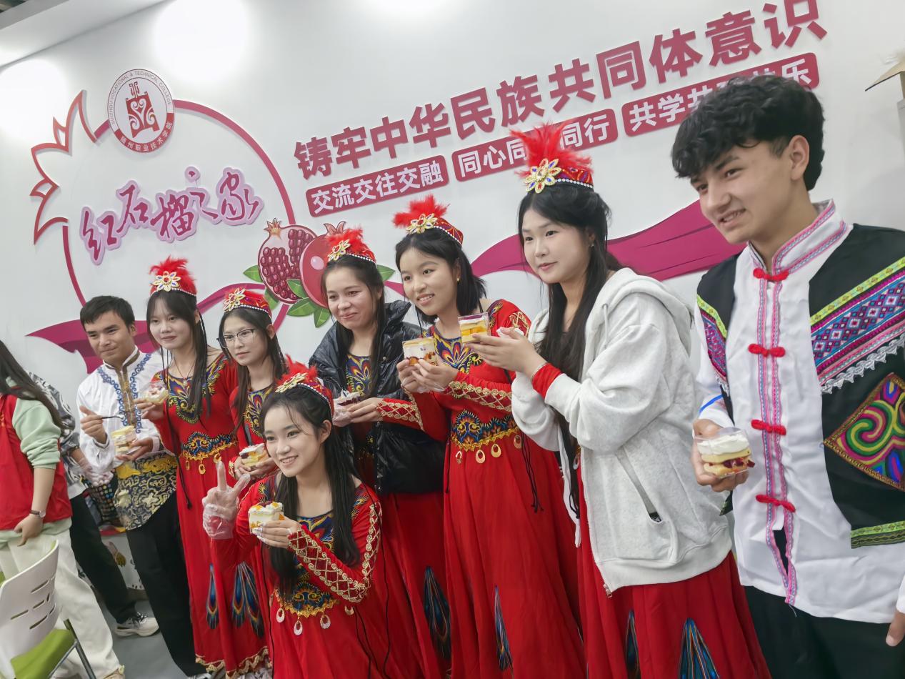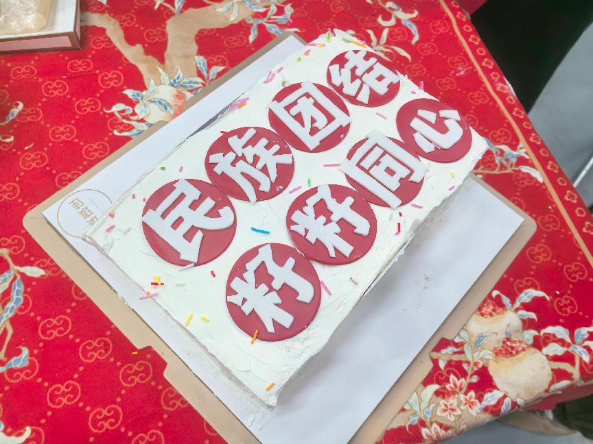 現(xiàn)場(chǎng)還開(kāi)展了互動(dòng)體驗(yàn),同心手串制作、美食品嘗、語(yǔ)言交流等環(huán)節(jié),讓大家在參與中增進(jìn)相互了解,體驗(yàn)不同民族的生活習(xí)俗和文化特色。56名同學(xué)現(xiàn)場(chǎng)制作的“民族團(tuán)結(jié) 籽籽同心”蛋糕,寓意民族團(tuán)結(jié)一家親,不僅加深了彼此之間的友誼,也讓大家深刻體會(huì)到了“五十六個(gè)民族是一家”的深刻內(nèi)涵。