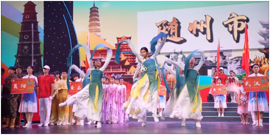 開(kāi)幕式上,來(lái)自全省17個(gè)市(州)的代表隊(duì)以舞蹈的形式展現(xiàn)各地風(fēng)俗文化。隨州被譽(yù)為“編鐘古樂(lè)之鄉(xiāng)”,為更好地凸顯“編鐘文化”,五眼橋小學(xué)精心編排了編鐘樂(lè)舞。隨著引領(lǐng)員和旗手的指引,隨州代表隊(duì)閃亮登場(chǎng)。合著音樂(lè)節(jié)拍,孩子們翩遷起舞,水袖輕揚(yáng),靈動(dòng)飄逸,真乃是“翩
