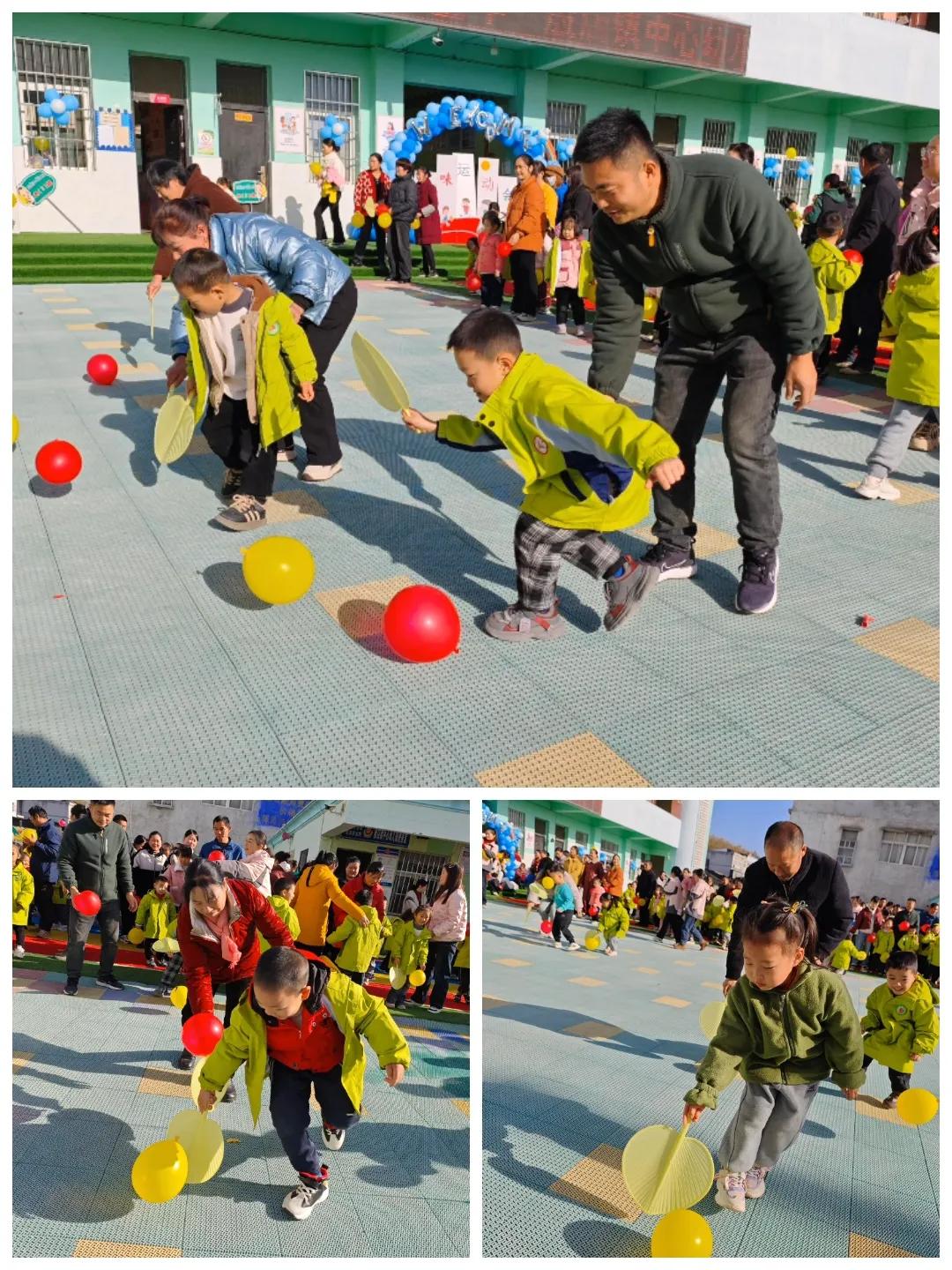 游戲一:《夾球歡樂跳》、游戲二:《蒲扇趕氣球》、游戲三:《氣球爆炸啦》、 游戲四:《我們抱一抱》。 游戲中,孩子們的小臉上洋溢著天真爛漫的笑容,他們勇敢地挑戰(zhàn)自我,與父母攜手并肩,共同跨越了一道道難關(guān)。