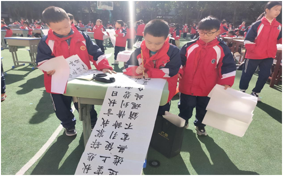 課間,學(xué)生“快樂書寫”活動在學(xué)校大操場盛大舉行。曾都區(qū)實驗小學(xué)200余名學(xué)生在金色的陽光下,向與會嘉賓展示了自己優(yōu)秀的書寫能力、剪紙?zhí)亻L和學(xué)校的藝術(shù)教育成果。孩子們的出色表現(xiàn),贏得現(xiàn)場觀看的老師和專家們的盛贊和好評。
