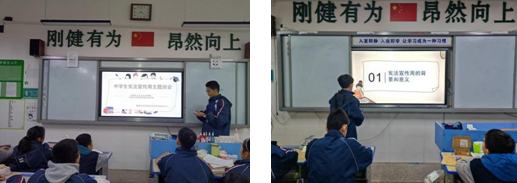 學(xué)校法治教育領(lǐng)導(dǎo)小組召開(kāi)會(huì)議、制定學(xué)習(xí)活動(dòng)計(jì)劃。德育成長(zhǎng)中心負(fù)責(zé)制定實(shí)施方案;班主任組織主題班會(huì)、晨讀。