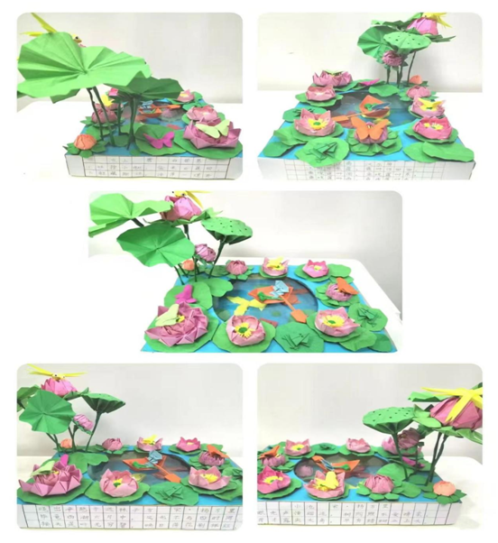 二年級語文組以“傳承手工藝術(shù),放飛指尖夢想”為主題,孩子們在家長和老師的指導(dǎo)下,用樹葉、彩紙、黏土、紙殼、扭扭棒等多種材料制作出了精美的手工作品——小小茅屋,靜謐溫馨;紅蓮碧葉,彩蝶翩飛……心靈手巧,令人贊嘆。