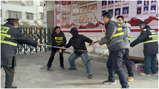 上午10時(shí),警情發(fā)生,學(xué)校安保人員迅速按下“一鍵報(bào)警按鈕”報(bào)警。學(xué)校迅速啟動(dòng)反恐防暴應(yīng)急預(yù)案,應(yīng)急防暴組成員手持器械迅速趕到學(xué)校大門口,處置突發(fā)事件。只見(jiàn)一蒙面“歹徒”手持兇器企圖闖入校園,班級(jí)教師沉著冷靜,關(guān)好門窗,快速組織好學(xué)生隱蔽躲藏,全力以赴保障學(xué)生的安全。安保人員和應(yīng)急防暴小組成員手持防暴鋼叉等器械與“歹徒”進(jìn)行對(duì)峙、周旋,最終成功將“歹徒”制服。
