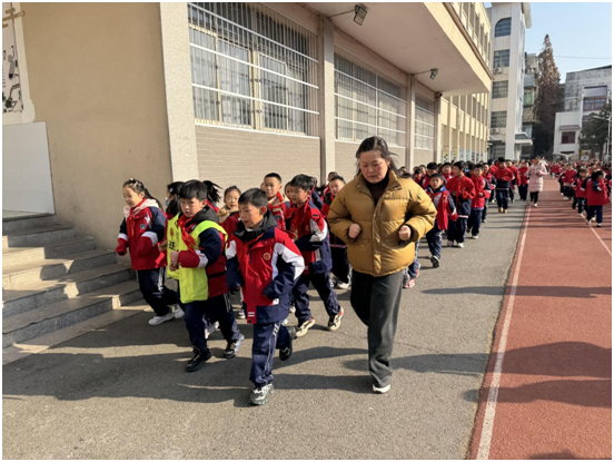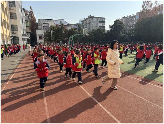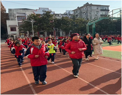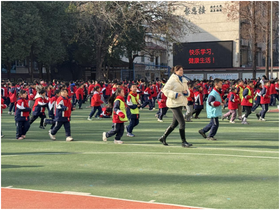 在曾都區(qū)實驗小學,陽光體育鍛煉時間到,伴隨著歡快激昂的進行曲,操場上一片熱火朝天的運動景象。同學們在老師的帶領(lǐng)下開始了健身“三部曲”:《中國字 中國人》集體舞,孩子們認真專注,把對書法的熱愛融進一招一式的手勢舞動作里;《第九套廣播體操》,師生同做,規(guī)范標準,在舉手抬足和蹦蹦跳跳中感受生命的活力;健身花樣跑,39個班級化身39列踩著卡點有序奔跑前進的“小火車”,大操場、小操場,綠茵場、塑膠跑道,校長領(lǐng)跑,老師帶跑,同學們精神抖擻、步伐整齊,以鏗鏘有力的口號聲展示著運動的快樂和班級魅力。