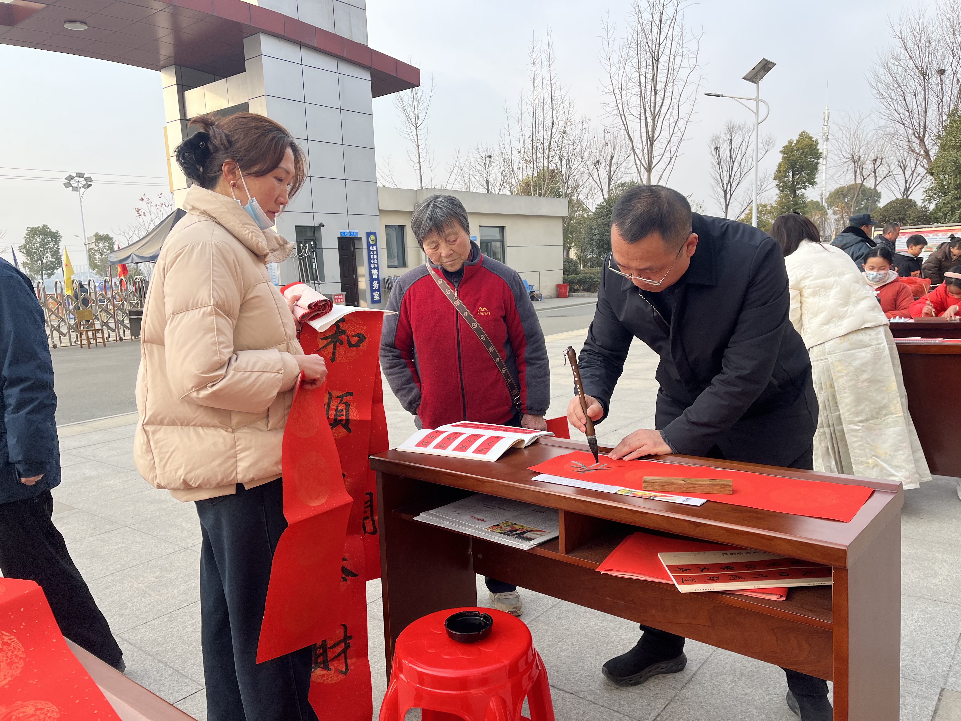 活動(dòng)現(xiàn)場氣氛熱烈,一張張紅彤彤的春聯(lián)紙整齊地鋪在桌上,墨香四溢。教師們展現(xiàn)出精湛的書法技藝,學(xué)生們也不甘示弱,他們認(rèn)真地蘸墨、起筆、收筆,雖然筆法略顯稚嫩,但每一個(gè)字都充滿了童真與熱情。平日里守護(hù)校園的門衛(wèi)師傅也參與其中,用他們獨(dú)特的筆觸為活動(dòng)增添了一份別樣的溫暖。拿到春聯(lián)的居民們臉上洋溢著喜悅的笑容,紛紛為此次活動(dòng)點(diǎn)贊。