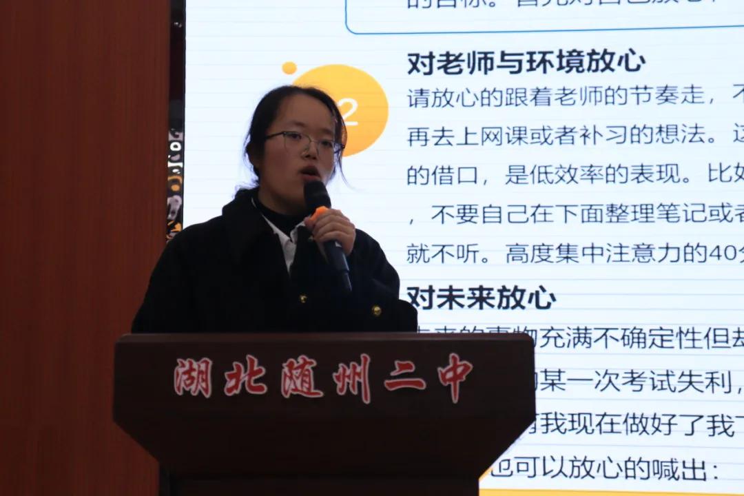 優(yōu)秀畢業(yè)生劉千婧以自身經(jīng)歷引入主題,分享了高中學(xué)習(xí)的關(guān)鍵詞——“放心、狠心、開(kāi)心”,并結(jié)合華中科技大學(xué)的介紹,鼓勵(lì)高三學(xué)子保持積極心態(tài)。她強(qiáng)調(diào)要放心跟隨老師節(jié)奏,狠心整理筆記、改錯(cuò)、做題,同時(shí)保持開(kāi)心,享受學(xué)習(xí)過(guò)程。她還介紹了華中科技大學(xué)的學(xué)術(shù)氛圍和學(xué)習(xí)環(huán)境,同時(shí)對(duì)高三各門學(xué)科的具體學(xué)習(xí)方法與應(yīng)試技巧、備考階段的心態(tài)調(diào)整等方面分享自己的寶貴經(jīng)驗(yàn)。