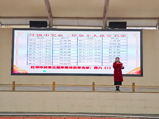 副校長(zhǎng)朱嬌嬌宣讀學(xué)校關(guān)于表彰2024年度紅領(lǐng)巾獎(jiǎng)?wù)氯钦聜(gè)人和集體名單、優(yōu)秀學(xué)生會(huì)干部、優(yōu)秀主持人、升旗手、護(hù)旗手、寒假社會(huì)實(shí)踐優(yōu)秀個(gè)人、優(yōu)秀中隊(duì)集體的決定。