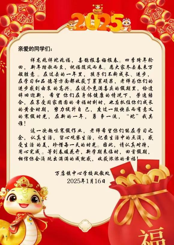 萬店初級中學寒假實踐作業(yè)不僅豐富了孩子們的假期生活,更讓他們在實踐中收獲了知識、能力和快樂。希望在新的學期里,同學們能將這份熱情延續(xù)到學習生活中,用努力和堅持書寫更加精彩的篇章!