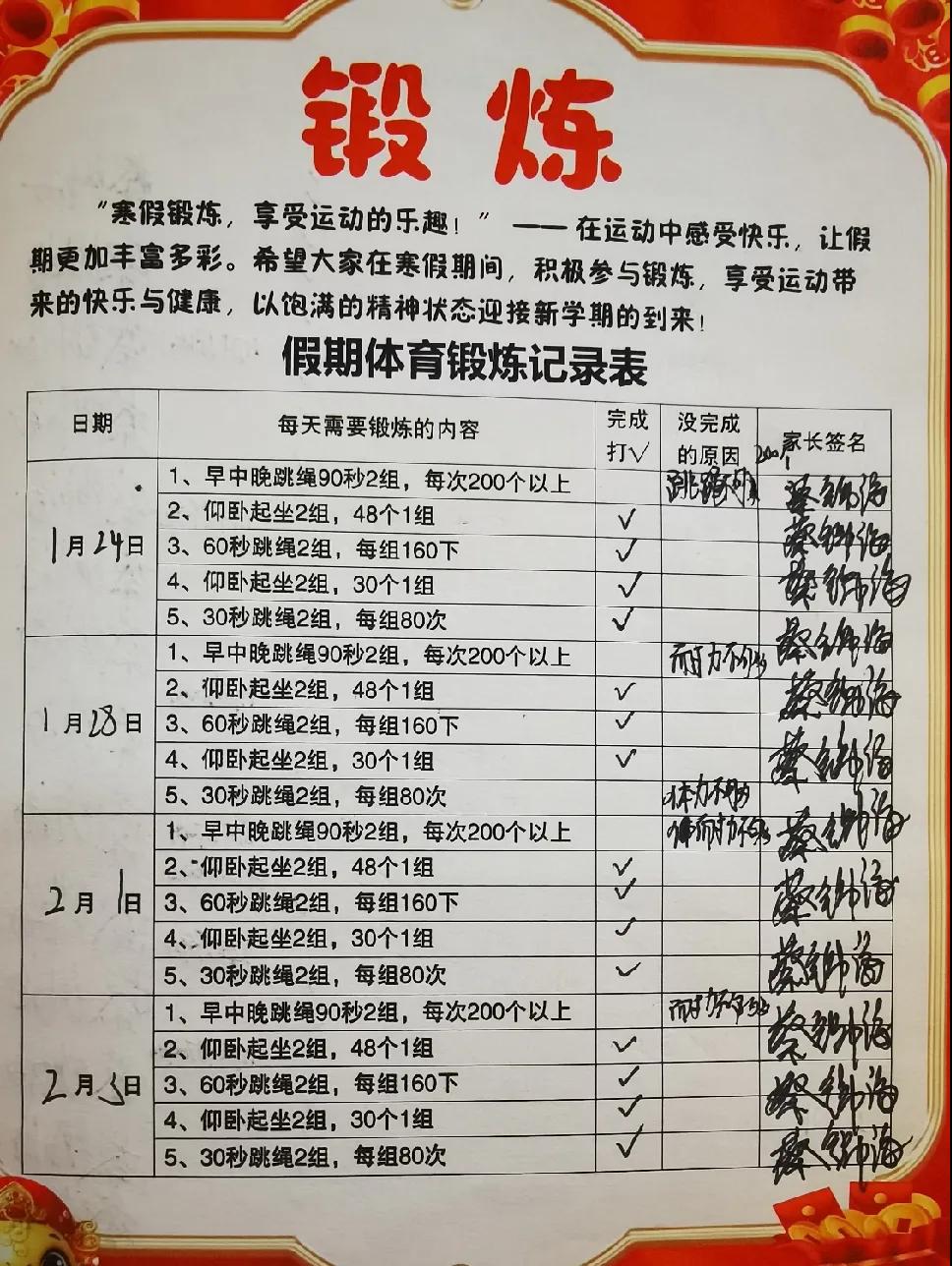 健康的身體是學習和生活的基礎。寒假期間,同學們積極參加體育鍛煉,有的同學堅持每天跑步,有的同學練習跳繩,還有的同學堅持做仰臥起坐。通過鍛煉,他們不僅增強了體質(zhì),更培養(yǎng)了堅韌不拔的毅力。以下是同學們假期體育鍛煉記錄表。