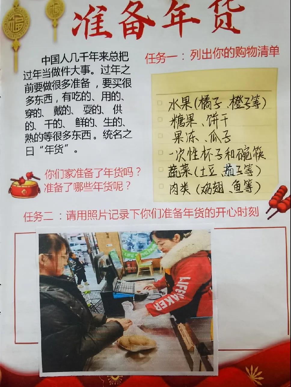 春節(jié)是中國最重要的傳統(tǒng)節(jié)日,蘊含著豐富的文化內(nèi)涵。同學們圍繞春節(jié),開展了豐富多彩的實踐活動。有的同學創(chuàng)作了蛇年春聯(lián),學以致用,讓自己的創(chuàng)意在新年中熠熠生輝;有的同學剪出精美的窗花,用紅紙傳遞出濃濃的年味。