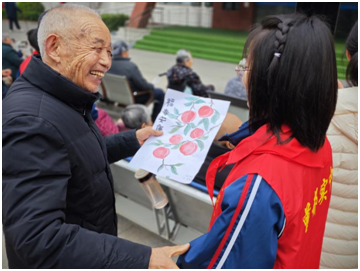 在區(qū)社會(huì)福利院,由師生志愿者共同表演的開場(chǎng)舞《奇妙的驚喜》瞬間點(diǎn)燃全場(chǎng),歡快的節(jié)奏和動(dòng)感的舞姿,讓爺爺奶奶們也被這份青春的活力所感染,跟隨著節(jié)奏扭動(dòng)身體。演唱歌曲《學(xué)習(xí)雷鋒好榜樣》、朗誦《中華孝道》。文藝表演結(jié)束后,志愿者們拿出自己親手繪制的書畫和剪紙作品贈(zèng)予老人們。