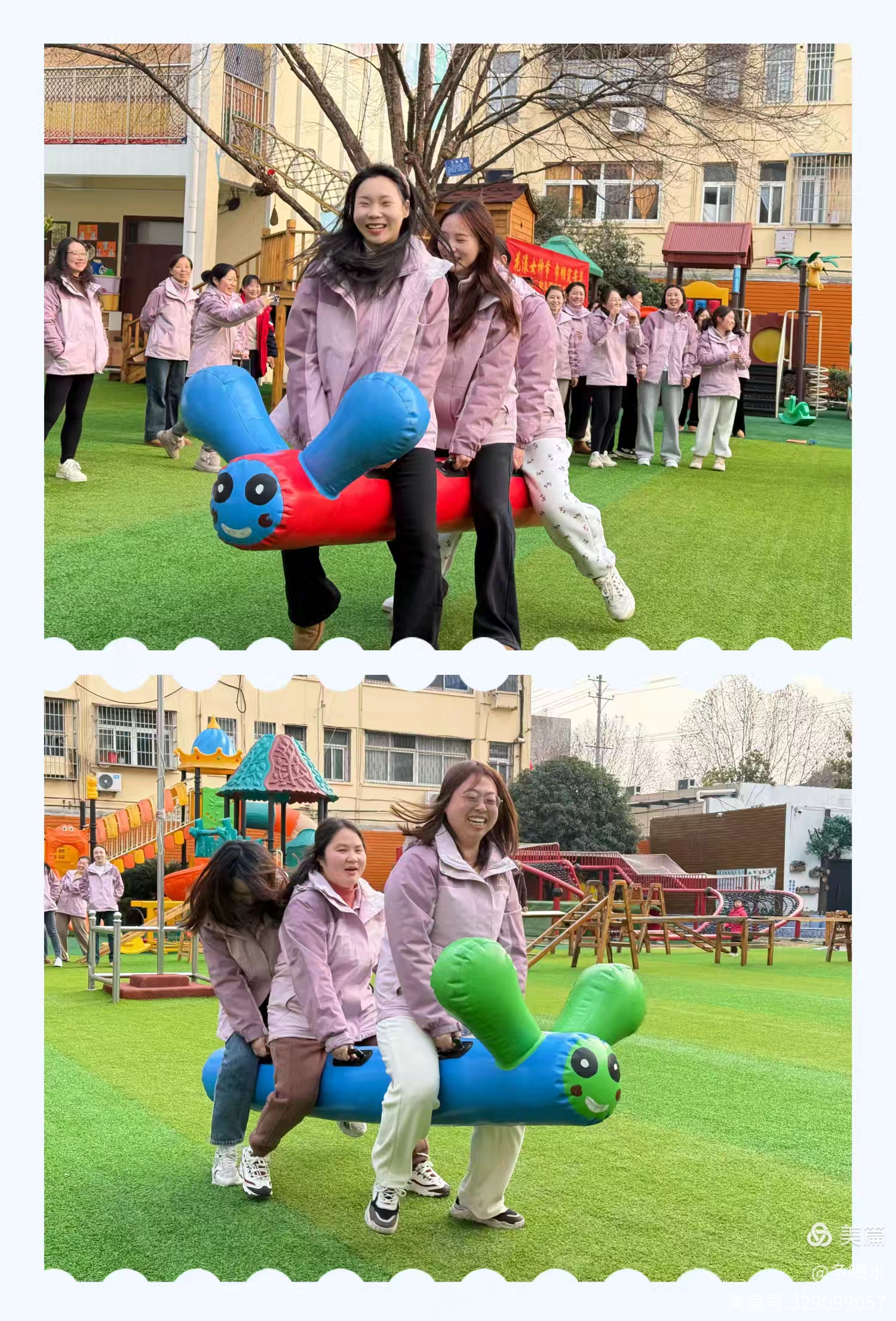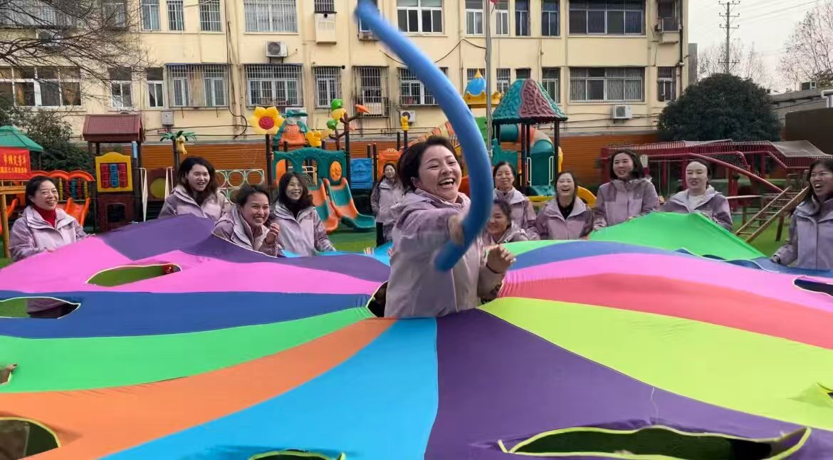 精彩紛呈的游戲環(huán)節(jié)到了,一個個互動小游戲讓大家摩拳擦掌,使出渾身解數(shù),圍觀的教師為他們鼓勁吶喊,加油助威,幼兒園操場到處是一片歡樂的海洋。每一個游戲都是對教師團體默契度的考量,老師們齊心協(xié)力,機智靈活,展現(xiàn)了二幼教師健康向上、充滿活力的精神面貌。