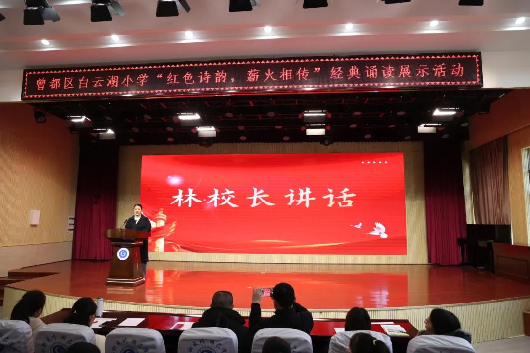 活動伊始,曾都區(qū)白云湖小學(xué)校長林海艷在致辭中強調(diào),紅色經(jīng)典詩文是中華文化的瑰寶,希望同學(xué)們通過誦讀活動,感受經(jīng)典之美,領(lǐng)悟經(jīng)典之智,傳承經(jīng)典之魂,號召全校師生更加積極地投身到經(jīng)典誦讀活動中來,讓經(jīng)典誦讀成為我們生活的一部分,讓中華優(yōu)秀傳統(tǒng)文化在校園里生根發(fā)芽,開花結(jié)果。