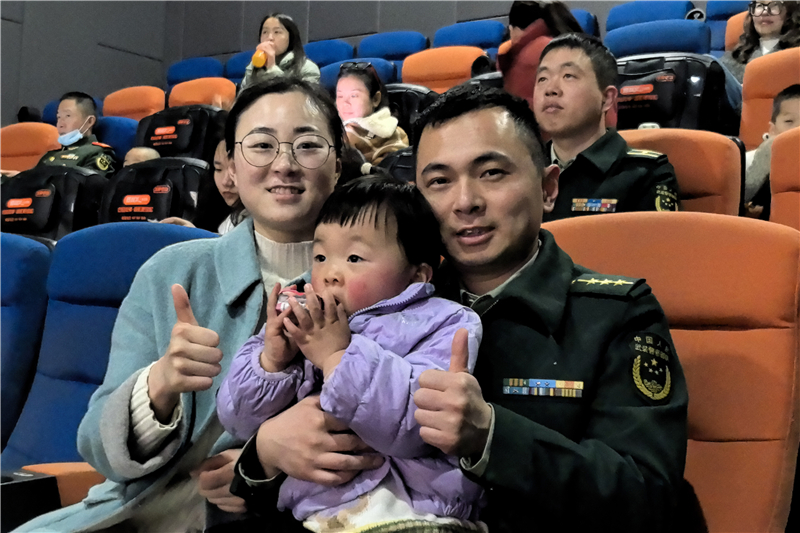 活動(dòng)集體觀影”環(huán)節(jié),伴著暖心的燈光,官兵與家屬們并肩而坐,熒幕上的光影流轉(zhuǎn)間,軍嫂們輕輕握住丈夫的手,孩子們依偎在父母懷中,溫馨的氛圍充滿了家的暖意。
