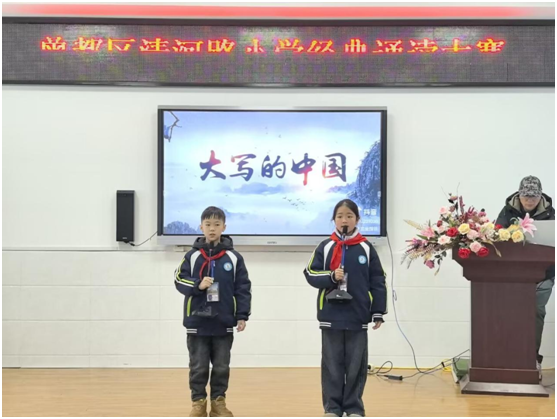 四(1)班宋承峻、薛允菡同學誦讀《大寫的中國》,彰顯屬于少年的獨特颯爽風采。孩子們用聲音勾勒祖國壯麗山河,誦出歷史厚重與今朝輝煌。從他們對祖國緩緩的深情告白,領略到大國無限魅力。