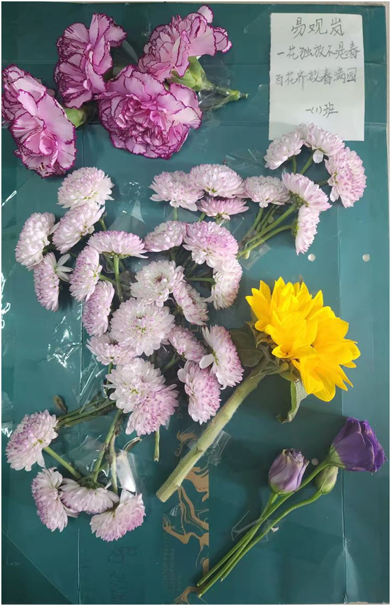向日葵、康乃馨以及小菊花等匯聚成一片絢麗多彩的花海。每一種顏色和形狀因獨(dú)特而和諧,共同構(gòu)成一張視覺上的盛宴圖。“一花獨(dú)放不是春,百花齊放春滿園。”這幅繁華景象象征著生命的堅(jiān)韌不屈與濃烈愛意,也為我們忙碌的生活帶來片刻寧靜和樸實(shí)的美好,同時(shí)也表達(dá)了孩子們共同進(jìn)步的決心和對(duì)祖國文化繁榮昌盛的美好祝愿!