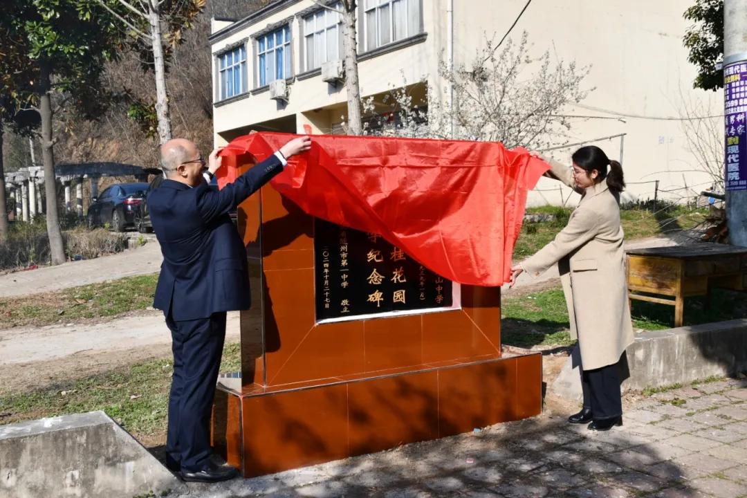 在隨縣洪山鎮(zhèn)桂花園村文化廣場,梁勇與陳娟娟共同為“洪山桂花園辦學(xué)紀(jì)念碑”揭幕。沈德勇、陳娟娟、桂花園村黨支部書記佘偉先后致辭。