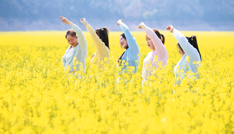 金黃的油菜花海吸引了眾多游客踏青賞花,樂享春光!斑@里有城里看不到的風(fēng)景,心情非常愉悅!眮碜噪S州城區(qū)的郭桂林說,自己常約好友出門觀光拍照,此次她們一行6人,“組團(tuán)”來到柳林賞花踏青。
