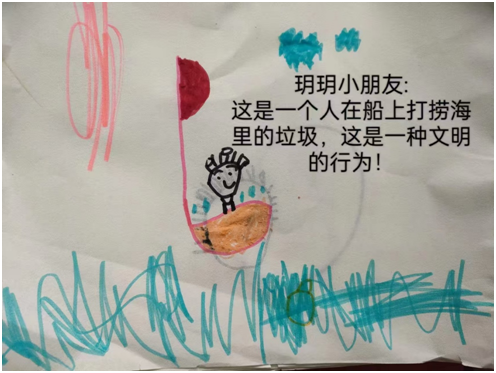 在玥玥小朋友的畫中,她手持小網(wǎng)兜,正在模擬海洋的場景中認(rèn)真“打撈垃圾”。這一場景源自幼兒園開展的“保護(hù)地球”實(shí)踐課。孩子們通過角色扮演,學(xué)習(xí)了垃圾分類、節(jié)約資源等環(huán)保知識,將文明行為延伸到對環(huán)境的關(guān)愛中。玥玥用童真的語言表達(dá)了自己的行動:“垃圾不回家,大海會生病。我要做大海的好朋友!”孩子們在活動中不僅增強(qiáng)了環(huán)保意識,更懂得了文明行為對保護(hù)地球的重要性。