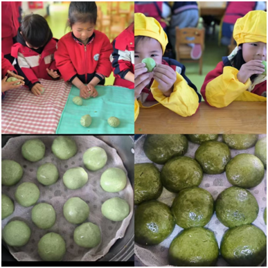制作青團時,場面更是熱鬧非凡。老師示范著將糯米粉、艾草汁混合,揉成翠綠面團,孩子們有樣學(xué)樣,小手雖然不太靈活,但熱情高漲。包餡料、搓青團,一個個青團在他們手中誕生,盡管形狀不太規(guī)則,卻飽含童真童趣。