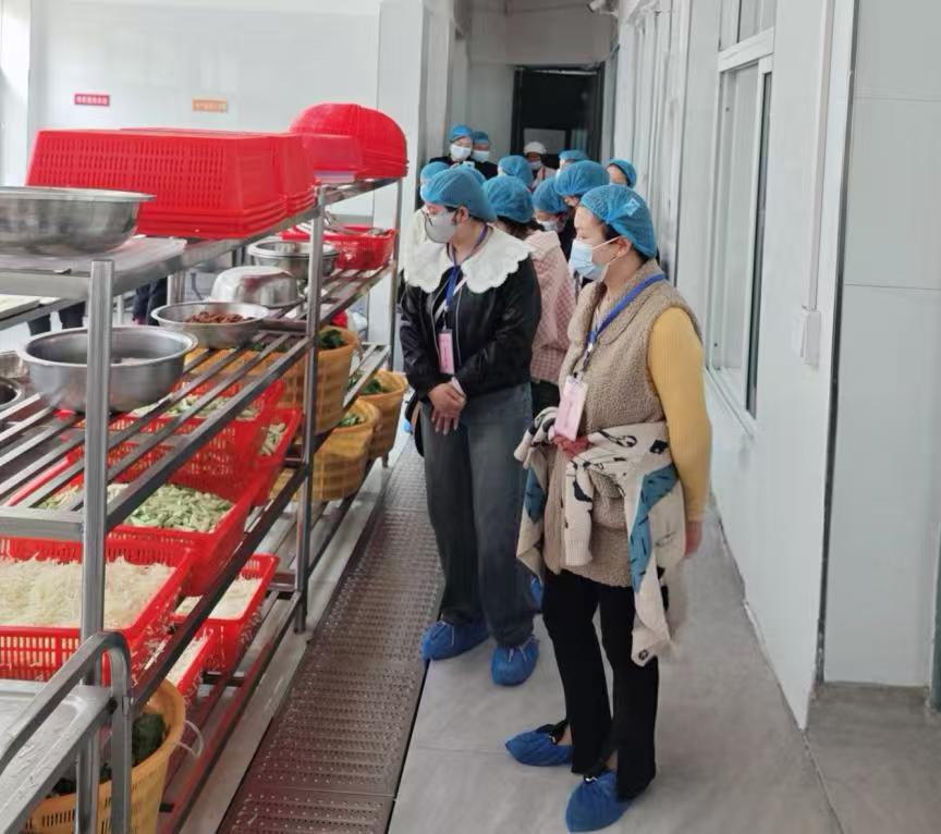 副食庫,米面糧油分類存放,離地隔墻,溫濕度實(shí)時(shí)監(jiān)控;入庫間,食材進(jìn)出庫嚴(yán)格登記,食材供應(yīng)商資質(zhì)及每日檢測(cè)結(jié)果可溯源備查;食品制作間,生熟分區(qū)操作,用具區(qū)域管理;備餐區(qū),餐品恒溫保存,工作人員規(guī)范佩戴口罩、手套;分餐觀摩,現(xiàn)場(chǎng)觀看低年級(jí)分餐流程,餐量按年級(jí)科學(xué)調(diào)配,確保學(xué)生營養(yǎng)均衡。