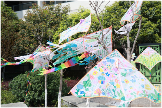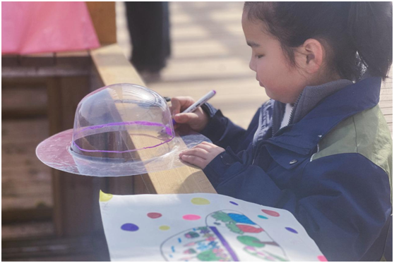 他們邊畫邊說到:“蝴蝶翅膀是彩虹色的,因?yàn)樗獛托』▊鞑セǚ郏 薄拔业娘L(fēng)箏上有會下雨的云朵,落下來都是櫻花花瓣!”“風(fēng)箏尾巴要畫上小蜜蜂,這樣它就能帶著花香飛遍校園啦!”,透過孩童的眼看春天,將春的美麗與活力盡展。