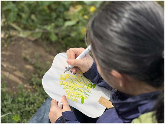 五年級的孩子們用畫筆捕捉春天的每一寸生機(jī)。他們蘸滿明亮的色彩,在扇面上揮灑出嫩綠的新芽、粉白的櫻花、金黃的油菜花田,還有掠過晴空的蝴蝶。有的同學(xué)用細(xì)膩的筆觸描繪春樹,有的用大膽的色塊表現(xiàn)陽光下怒放的野花。
