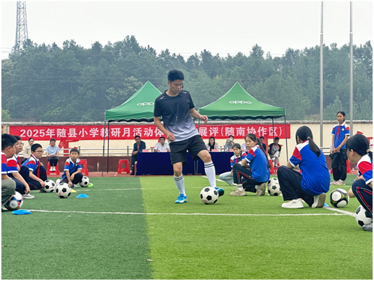 來自隨南協(xié)作區(qū)的8名小學(xué)語文教師,圍繞經(jīng)典課題呈現(xiàn)了精彩的課堂設(shè)計,他們憑借深厚的教學(xué)功底與創(chuàng)新思維,或帶學(xué)生穿越歷史硝煙,感悟英雄的鐵血意志;或引領(lǐng)孩童踏入童話秘境,品味語言的奇妙。5名體育老師就《足球—腳內(nèi)側(cè)運球與變向運用》進行了精彩的課堂展示,教師們以足球教學(xué)為切入點,將技能訓(xùn)練巧妙融入趣味游戲與實戰(zhàn)模擬中。通過梯度訓(xùn)練、個性化指導(dǎo)等多樣方式,激發(fā)學(xué)生的運動熱情。隨縣教研室領(lǐng)導(dǎo)親臨課堂進行指導(dǎo),為教研活動注入強勁動力。
