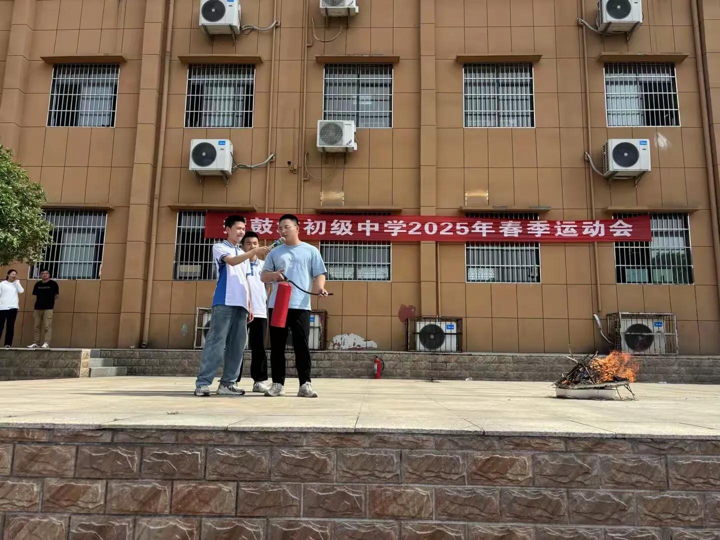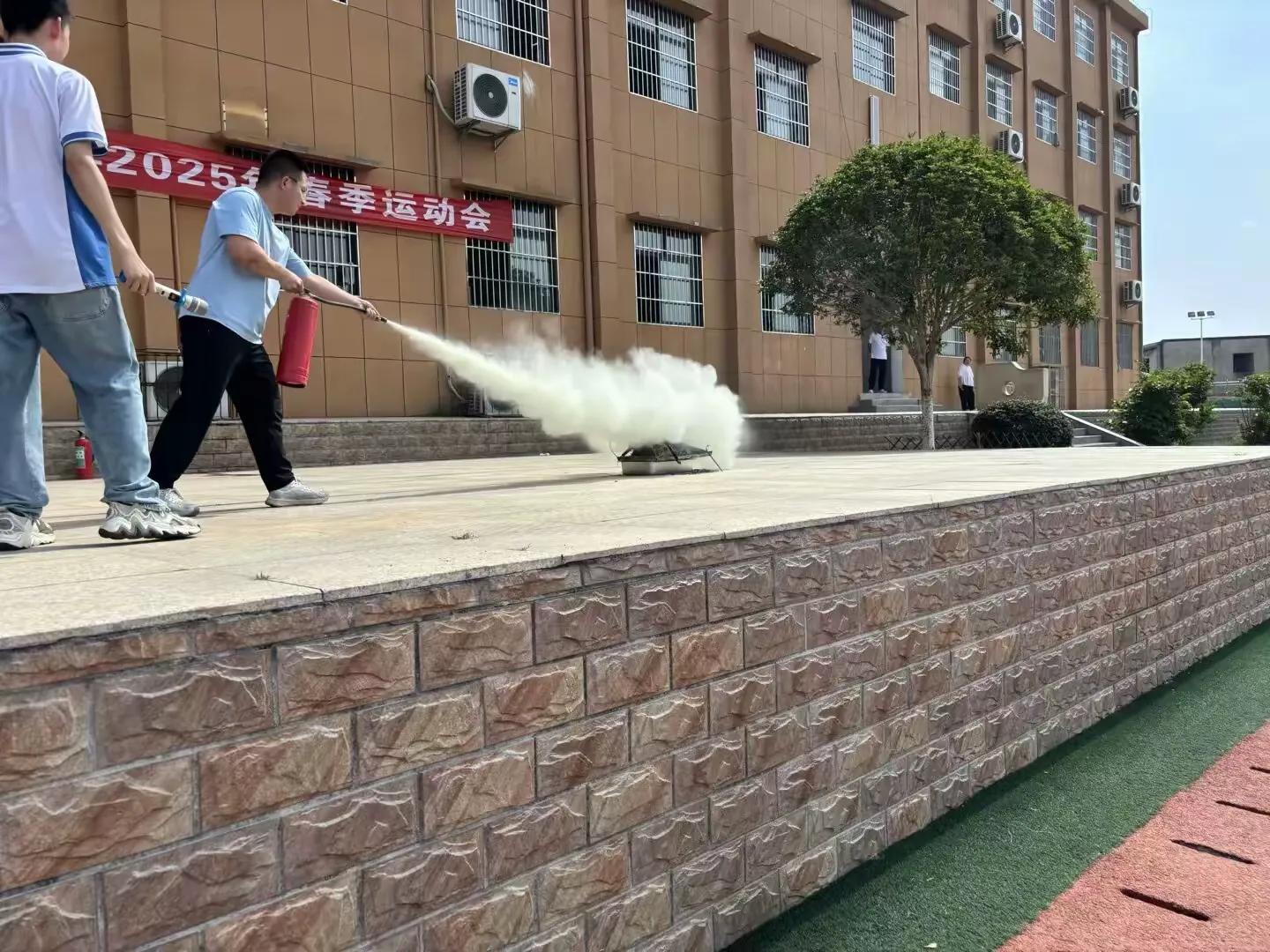 唐威老師給學(xué)生演示滅火器使用方法,并現(xiàn)場(chǎng)指導(dǎo)兩名學(xué)生操作。