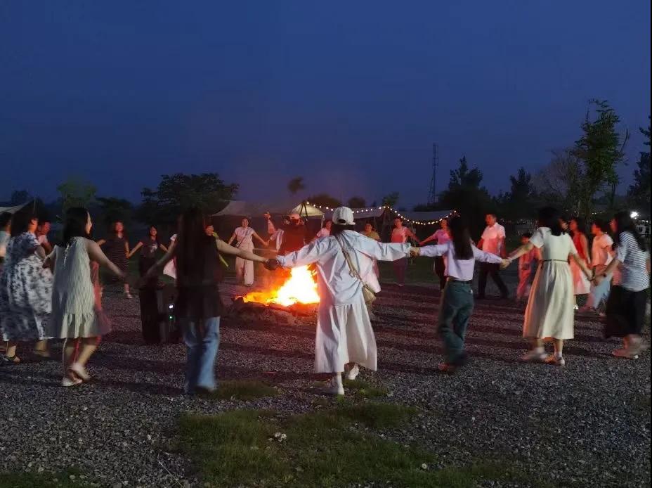 夜幕降臨,熊熊燃燒的篝火照亮了河畔!绑艋饸g歌” 活動在這溫暖的火光中拉開帷幕,教師們?nèi)挤艧熁,手牽手圍繞著篝火載歌載舞,每個人的臉上都洋溢著幸福的笑容。