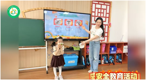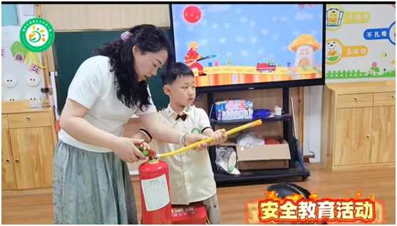 演練活動開始之前,幼兒園組織各班同上一節(jié)安全教育課,幼兒教師帶領(lǐng)幼兒了解火災危害,認識常見消防器材、了解器材使用方法,以及火災險情發(fā)生時的求救電話、應急逃生方法。