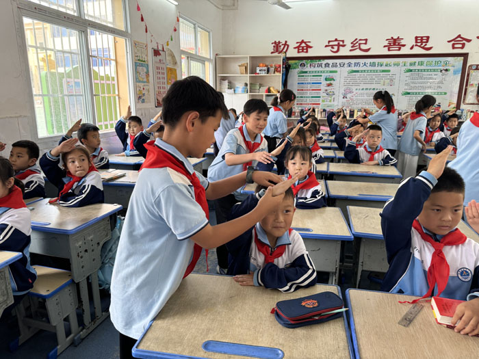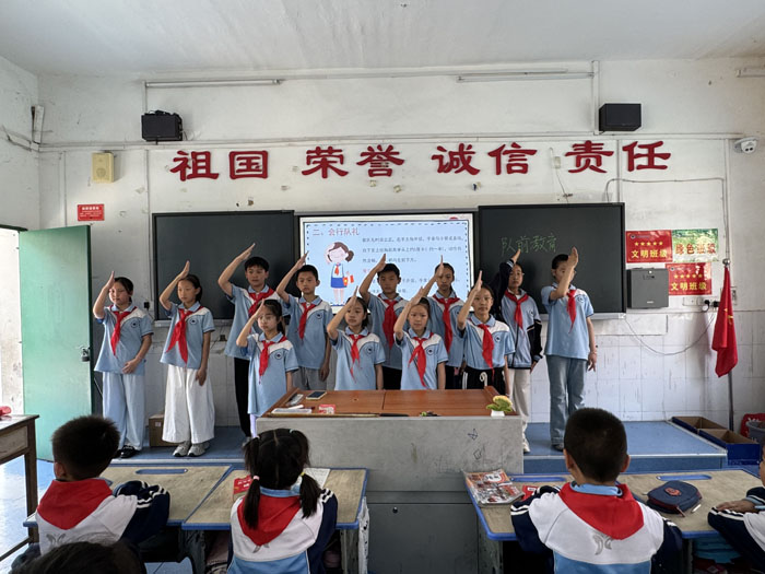 在學(xué)習(xí)完少先隊(duì)基本知識(shí)后,喻老師與大隊(duì)干部著手教孩子們什么是“六會(huì)”!邦I(lǐng)巾披肩尖,左壓右,右繞圈……”大隊(duì)干部手把手教萌娃們系紅領(lǐng)巾,稚嫩的手指反復(fù)練習(xí),直到鮮紅的三角巾在胸前綻開驕傲的“花”。挺直腰板學(xué)敬隊(duì)禮,五指并攏高舉過頭——“人民的利益高于一切”!呼號(hào)、宣誓、唱隊(duì)歌,童聲雖嫩,卻字字鏗鏘,儀式感中埋下責(zé)任的種子。