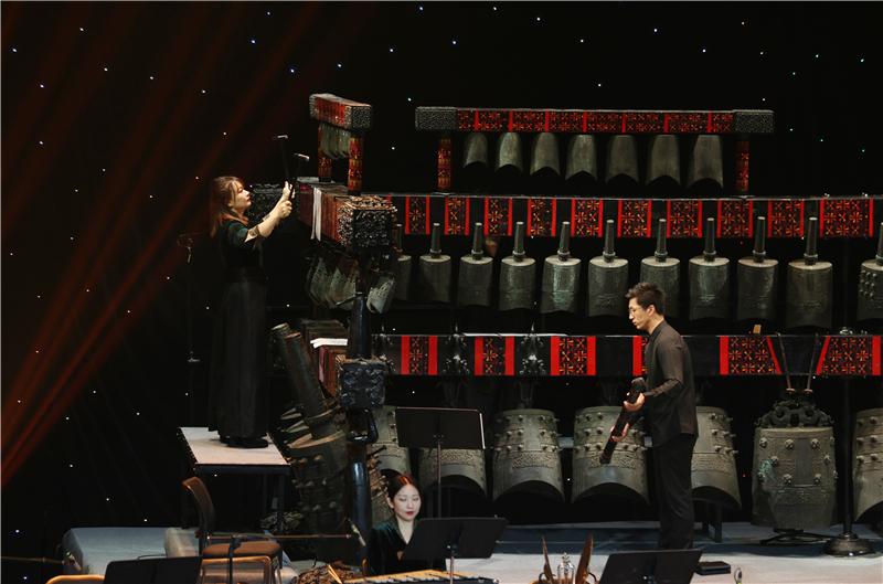 編鐘與民族管弦樂的融合是本場音樂會(huì)的一大亮點(diǎn)。《玄鳥》將編鐘那古樸神秘的音色與民族管弦樂交織,營造出神秘悠遠(yuǎn)的意境,仿佛帶領(lǐng)聽眾穿越時(shí)空,探尋古老的文化意象!肚G楚小調(diào)》巧妙融合荊楚地區(qū)音樂風(fēng)格,編鐘與管弦樂相互配合,生動(dòng)展現(xiàn)荊楚大地的獨(dú)特風(fēng)情。當(dāng)編鐘與管弦樂共同奏響《我的祖國》,歷史的厚重感與家國的莊嚴(yán)感撲面而來,每一個(gè)音符都凝聚著對祖國山河的熱愛。