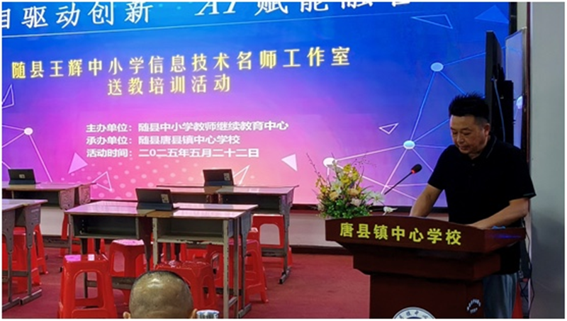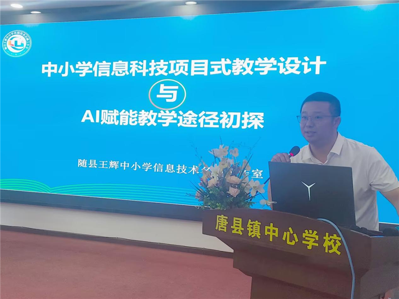 隨州日?qǐng)?bào)訊(通訊員:代旭、王輝 攝影:汪雄偉、彭森)5月22日,隨縣中小學(xué)教師繼續(xù)教育中心在唐縣鎮(zhèn)中心學(xué)校成功舉辦“項(xiàng)目驅(qū)動(dòng)創(chuàng)新,AI賦能融合”王輝名師工作室送教培訓(xùn)活動(dòng)。全縣各鎮(zhèn)(場(chǎng))信息技術(shù)教師、分管校長(zhǎng)及名師工作室成員齊聚一堂,共研信息科技項(xiàng)目式教學(xué)和AI技術(shù)與學(xué)科教學(xué)的創(chuàng)新實(shí)踐。