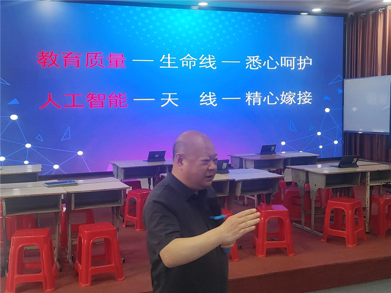 隨后,隨縣繼教中心主任蘇明東以“錨定方向,協(xié)同共進(jìn)”為主題發(fā)表講話。他深入解讀了國(guó)家人工智能教育政策,指出“AI與學(xué)科融合不是選擇題,而是必答題”,并呼吁各校分管校長(zhǎng)扛起技術(shù)賦能教育的責(zé)任。