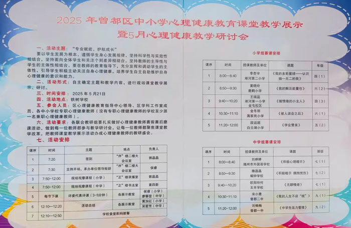 隨州新聞網(wǎng)訊(通訊員張霜)在新時(shí)代教育高質(zhì)量發(fā)展的浪潮中,心理健康教育已成為護(hù)航學(xué)生全面成長的關(guān)鍵力量。為深化心理健康教學(xué)改革,培養(yǎng)學(xué)生良好的心理素質(zhì),助力優(yōu)化教育營商環(huán)境,5月21日上午,曾都區(qū)中小學(xué)心理健康教育課堂教學(xué)展示暨5月心理健康教學(xué)研討會(huì)在鐵樹學(xué)校成功舉辦。