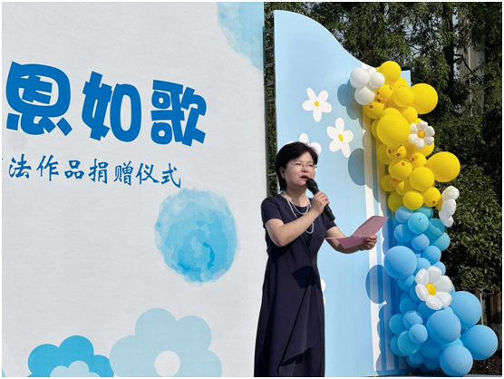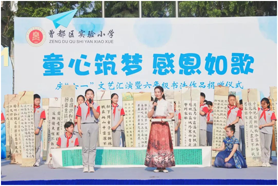 隨后,畢業(yè)生感恩母校書法捐贈(zèng)儀式正式開始。即將告別母校的校園小書法家們,經(jīng)過母校六年的書法熏染,他們執(zhí)筆為心,寫下了一幅幅飽含深情的書法作品。點(diǎn)、橫、撇、捺,每一幅作品都各有特色;篆、隸、楷、行,每一幅作品都凝聚著他們對(duì)母校的深深眷戀。他們將這些精心準(zhǔn)備的禮物,鄭重地捐贈(zèng)給母校,向母校遞交了一份精彩的感恩答卷。學(xué)校副校長(zhǎng)劉丹代表全體師生接受了這份珍貴的禮物,并對(duì)畢業(yè)生們寄予厚望,希望他們?cè)谖磥淼牡缆飞侠^續(xù)傳承母校賦予的筆墨精神,書寫精彩人生燦爛篇章。