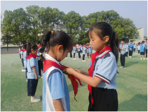 儀式現(xiàn)場,大隊輔導員宣讀新隊員名單后,五年級少先隊員為新隊員佩戴紅領(lǐng)巾并互敬隊禮。全體隊員面向隊旗莊嚴宣誓,鏗鏘有力的呼號聲響徹操場。