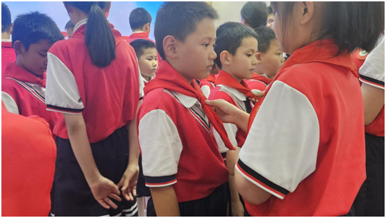 在"紅領(lǐng)巾心向黨"的歌聲中,五年級優(yōu)秀少先隊員為新隊員佩戴上鮮艷的紅領(lǐng)巾,象征著革命精神的代代傳承。