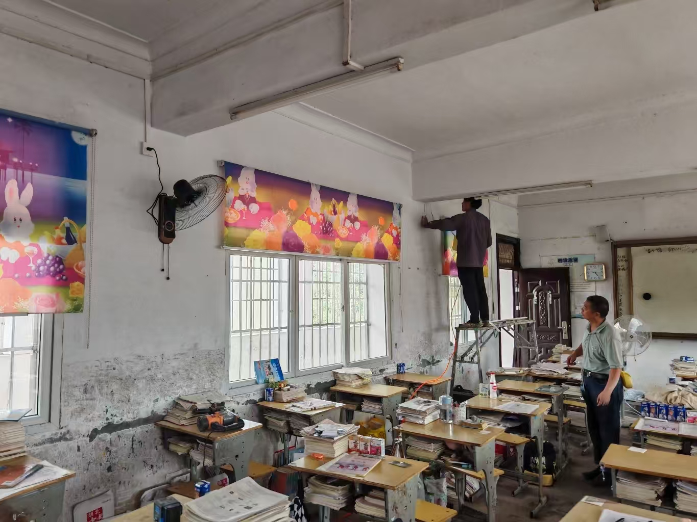 隨著氣溫升高,學(xué)校急師生之所急,迅速啟動(dòng)電風(fēng)扇安裝項(xiàng)目。對(duì)教學(xué)樓各教室、走廊進(jìn)行實(shí)地勘察,確定安裝方案。經(jīng)過精心籌備與施工,各年級(jí)教室的墻壁上安裝上嶄新的電風(fēng)扇,微風(fēng)輕拂,有效緩解了室內(nèi)悶熱。除在教學(xué)樓安裝壁扇、另外在食堂操作間也安裝了吊扇,共計(jì)100臺(tái),投資近兩萬元。