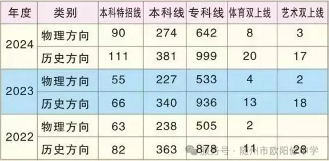 2023年,本科上線人數(shù)420人,過特招線人數(shù)達(dá)96人,物理方向占隨州市同類學(xué)校上本科線總數(shù)的63.42%,歷史方向占隨州市同類學(xué)校上本科線總數(shù)的60.11%。