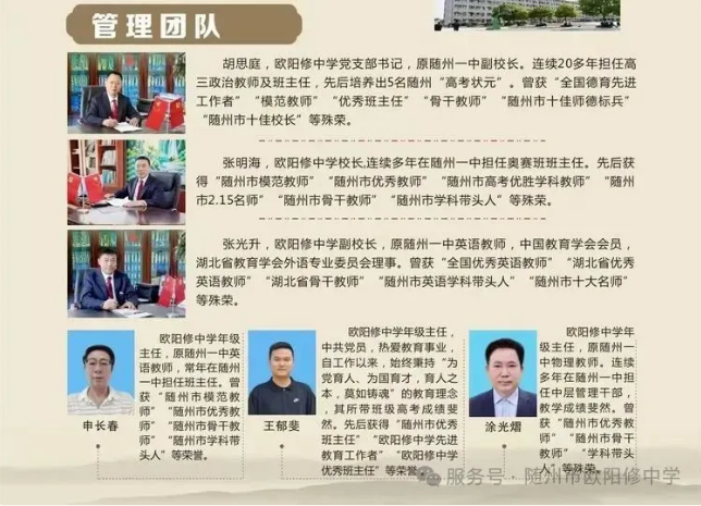 隨州市歐陽修中學(xué),創(chuàng)辦于2004年秋季,地處氵厥水湖畔,與隨州一中僅一巷之隔,作為與隨州一中締結(jié)的名校,學(xué)校始終堅(jiān)持五育并舉的教育理念,助力學(xué)生綜合素養(yǎng)的全面提升,享受隨州一中的優(yōu)質(zhì)教育資源。學(xué)校秉承“人為本、德為先、質(zhì)為上”的辦學(xué)理念,以“忠孝誠雅,堅(jiān)毅自信”為校訓(xùn),培養(yǎng)了大批具有高尚品德和卓越才能的學(xué)子。經(jīng)過二十載的不懈奮斗,學(xué)校碩果累累,教育成果逐年穩(wěn)步提高,本科升學(xué)人數(shù)與升學(xué)率持續(xù)在全市同類學(xué)校中遙遙領(lǐng)先,讓同層次學(xué)生大面積升入本科院校, 圓了無數(shù)考生的升學(xué)夢,被隨州市教育局評(píng)為“高考特色學(xué)!,彰顯出我校卓越的教育質(zhì)量和實(shí)力,同時(shí)也贏得了社會(huì)的普遍贊譽(yù)與認(rèn)可。