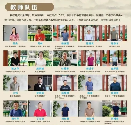 教學(xué)資源:學(xué)校擁有來自隨州一中的正高級(jí)教師、特級(jí)教師、省級(jí)名師十余名,高級(jí)教師三十余名,教學(xué)實(shí)力雄厚。