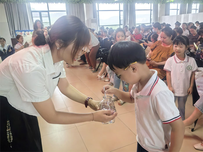 在感恩環(huán)節(jié),孩子們用一支溫暖治愈的手勢舞,向默默付出的家人傳遞著深深的謝意!敖o父母三鞠躬”儀式更是將情感推向頂點(diǎn),孩子們真摯的舉動(dòng)讓不少家長眼眶濕潤,現(xiàn)場彌漫著濃濃的親情。向父母表達(dá)感恩后,孩子們又面向老師深深鞠躬,用最樸實(shí)的方式感謝老師們的辛勤培育與無私關(guān)愛。家長們則認(rèn)真地寫下時(shí)光膠囊,將對孩子未來的美好期許一一封存,期待未來開啟時(shí)的驚喜與感動(dòng)。