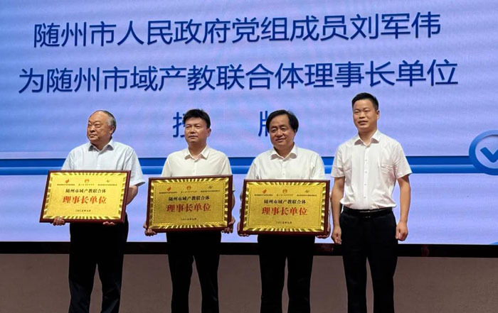 劉軍偉分別為隨州市域產(chǎn)教聯(lián)合體理事長單位和隨州市域產(chǎn)教聯(lián)合體副理事長單位授牌