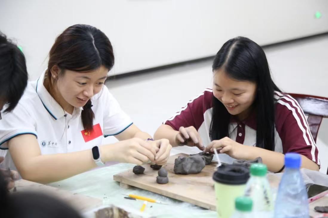 實(shí)踐隊(duì)充分發(fā)揮體育人優(yōu)良品德,將團(tuán)隊(duì)協(xié)作、追求卓越等體育精神內(nèi)核融入美育實(shí)踐;顒(dòng)伊始,美術(shù)館專業(yè)講解員帶領(lǐng)學(xué)員們賞析經(jīng)典書畫作品,通過“藝術(shù)小講堂”生動(dòng)解讀中國(guó)陶瓷文化的歷史脈絡(luò)與工藝精髓,并結(jié)合趣味有獎(jiǎng)競(jìng)答激發(fā)學(xué)習(xí)熱情。在陶藝制作環(huán)節(jié),專業(yè)教師現(xiàn)場(chǎng)演示非遺“泥條盤筑法”技藝,實(shí)踐隊(duì)員采用分組教學(xué)法指導(dǎo)學(xué)員完成創(chuàng)作,將體育中的集體觀念、規(guī)則意識(shí)、目標(biāo)管理融入創(chuàng)作過程,促進(jìn)學(xué)生發(fā)展集體榮譽(yù)感和責(zé)任意識(shí)。