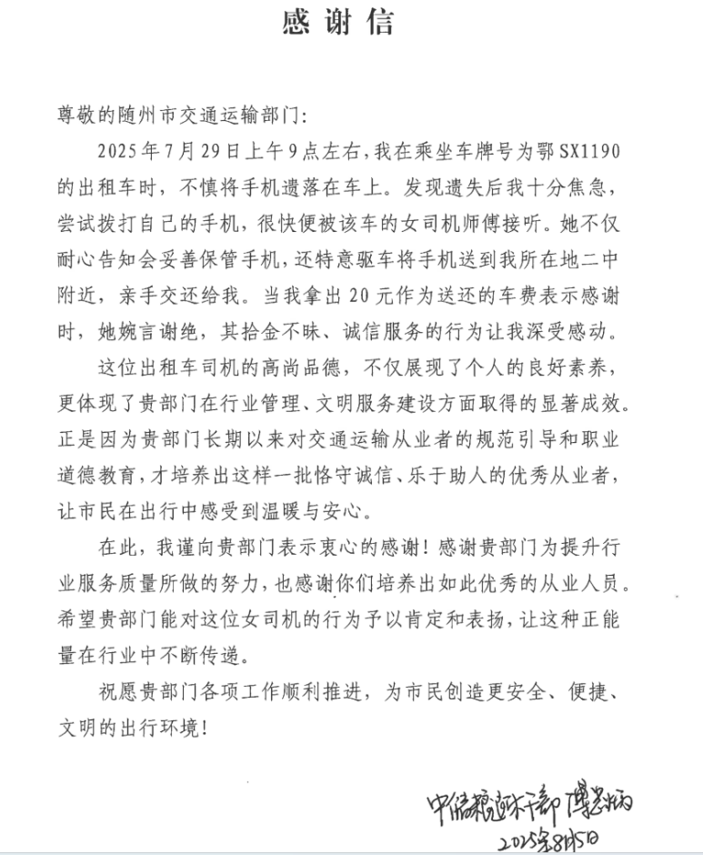 我市出租車司機隊伍的整體素質(zhì)和服務(wù)水平持續(xù)提升,好人好事不斷涌現(xiàn),傳遞著社會正能量。今年上半年涌現(xiàn)出拾金不昧的感人事跡3起,“愛心送考”1起,鄂SX1388張中于師傅撿到乘客3萬元現(xiàn)金完璧歸趙,鄂SX7668葉傳舟師傅撿到乘客5000余元現(xiàn)金和重要證件主動上交行業(yè)主管部門,鄂SX6896陳太兵師傅高考期間免費送考生趕考......這些平凡而溫暖的善舉,贏得了市民和乘客的高度認可。我市出租車司機共收到乘客贈送的感謝錦旗3面,感謝信4封,每一面錦旗和感謝信背后,都飽含著乘客對駕駛員優(yōu)質(zhì)服務(wù)、高尚品德的由衷感謝和“點贊”。出租車司機們用樸實的行動,詮釋了誠信、友善的社會主義核心價值觀,擦亮了行業(yè)的文明底色。